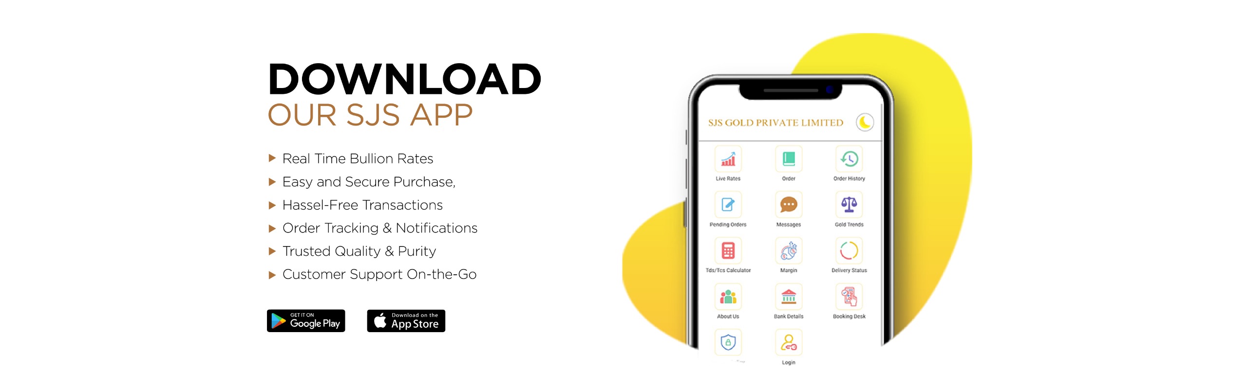 With our mobile app, customers can experience a smarter and faster way to trade gold, backed by the trust and credibility of SJS Group. Some of the key features of our mobile app includes: Real Time Bullion Rates, Easy and Secure Purchase, Hassel-Free Transactions, Order Tracking & Notifications, Trusted Quality & Purity, Customer Support On-the-Go.
